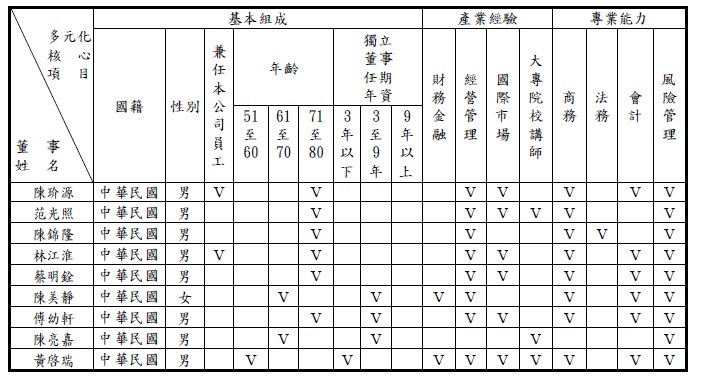 本公司提倡、尊重董事多元化政策,為強化公司治理並促進董事會組成與結構之健全發展,相信多元化方針有助提升公司整體表現。董事會成員之選任均以用人唯才為原則,具備跨產業領域之多元互補能力,包括基本組成(如:年齡、性別、國籍等)、也各自具有產業經驗與相關技能(如:金融、證券、財會、法律、教育及電子科技等),以及營業判斷、經營管理、領導決策與危機處理等能力。為強化董事會職能達到公司治理理想目標,本公司「公司治理守則」第 20 條明載董事會整體應具備能力如下: