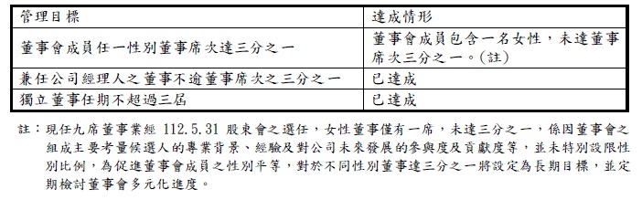 (2)董事會多元化政策之具體化管理目標及達成情形: